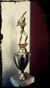 Paring down bulky items, I donated two music trophies to Goodwill. They were probably antiques because I hear trophies are no long metal. I took off the plates with what the trophies were for and I put them in some drawer. The purpose in saving them, only a reminder that I once won awards in music. The softball trophy I keep on my shelf still. Most people know about my music and how I used it. Few people know I was once good at softball. It felt important to keep the sports trophy as proof of my identity as a dyke. Silly isn’t it…or sad.