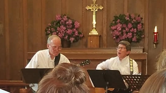 Dan Shepherd and Robin play guitar for congregational sing-a-long. Photo by Pan McCaslin